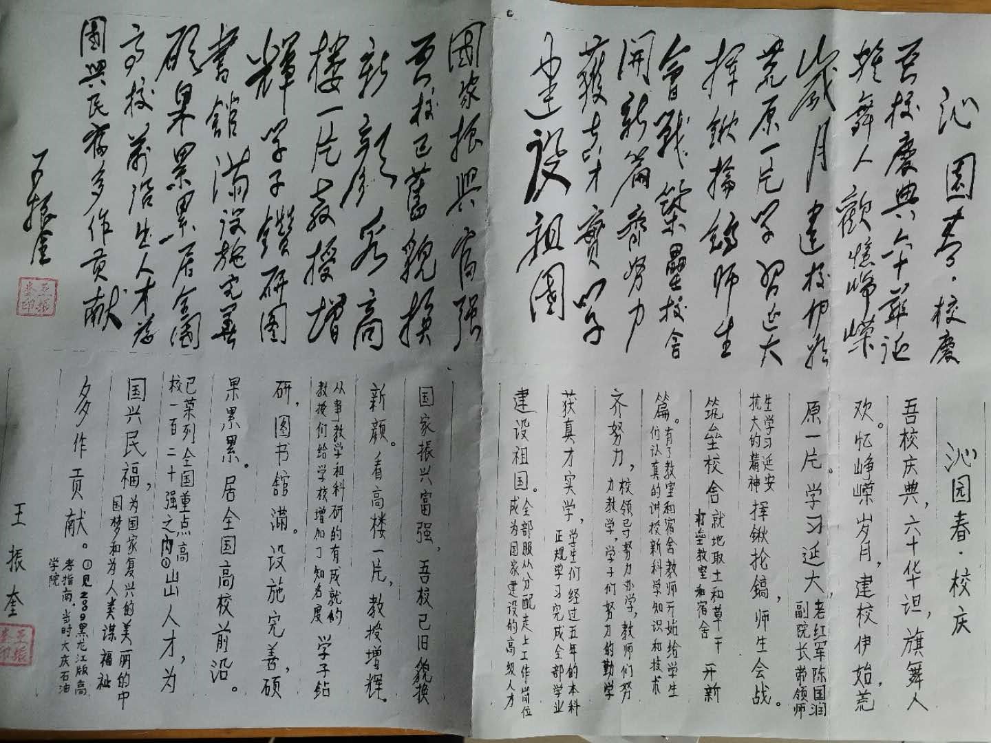 公司炼制59级王振奎员工为庆祝母校60周年校庆创作的诗词及书法作品